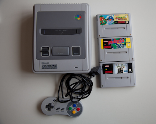 Snes med 1 hk, original strömadapter och RF-sladd samt 3 lösa spel