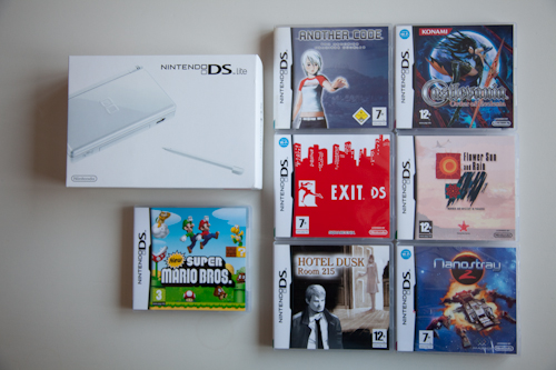 Ett Vitt DS Lite i mycket bra skick. Jag har spelat med lägsta ljusstyrkan på skärmen och laddat batteriet 5 ggr. Alla spel är kompletta i nyskick utom Another Code som är något blekt på ryggen samt har en reva i plasten på ryggen. Nanostray 2 är inplastat.